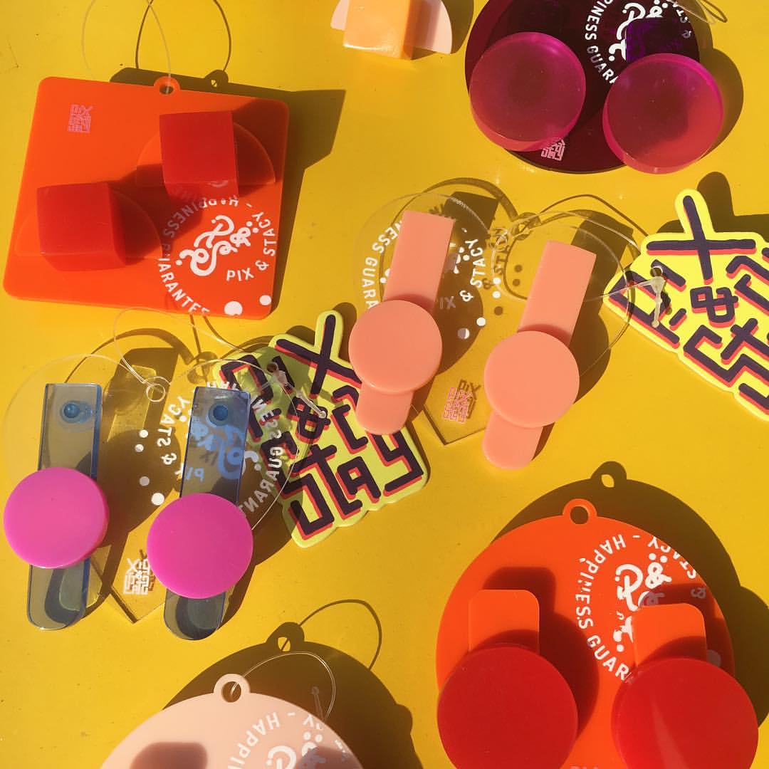 Pix & Stacy sendiri memiliki ciri khas dari bentuk dan juga warnanya yang unik. Bentuknya dibuat geometri yang terinspirasi dari bangunan arsitektur. Sementara warnanya dibuat mencolok agar memberikan kesan yang ceria.